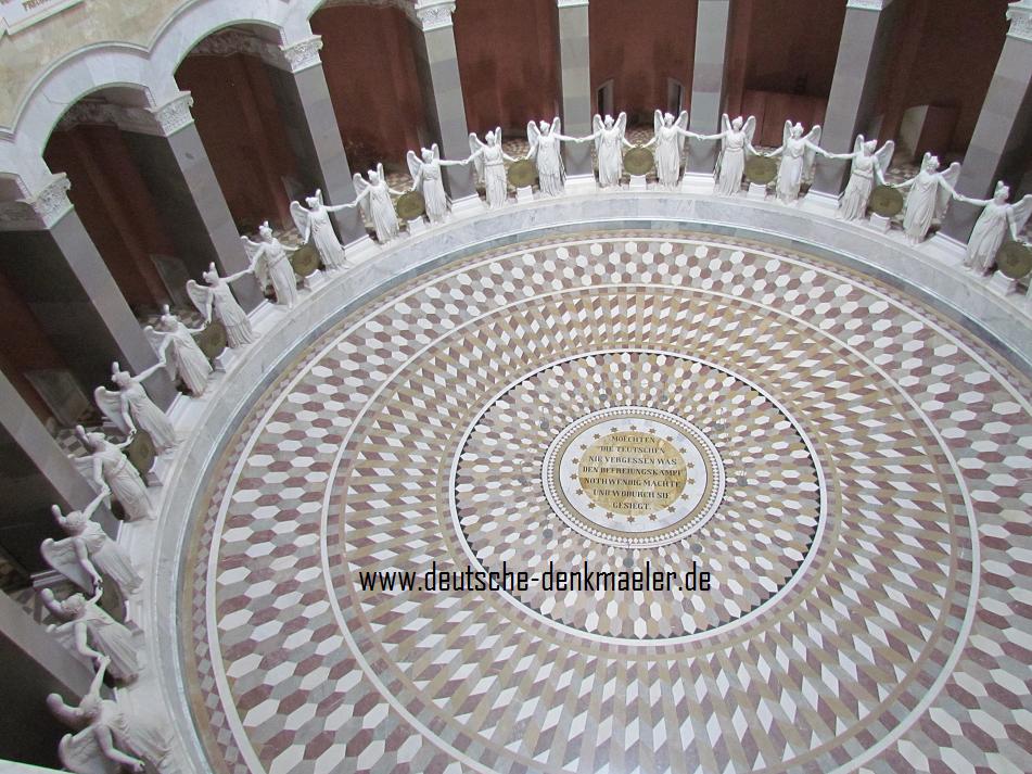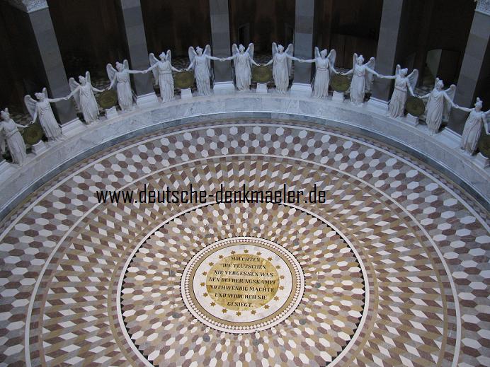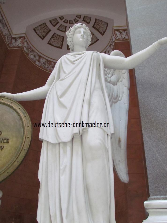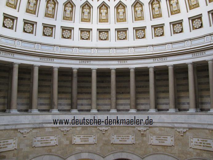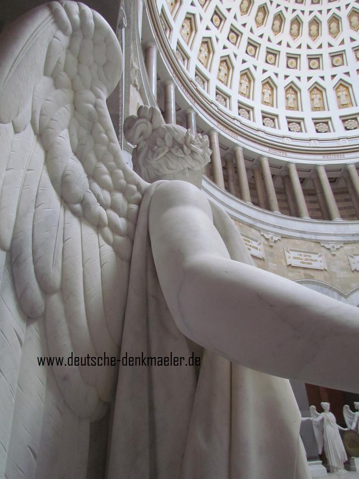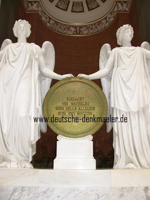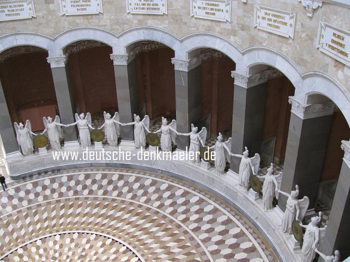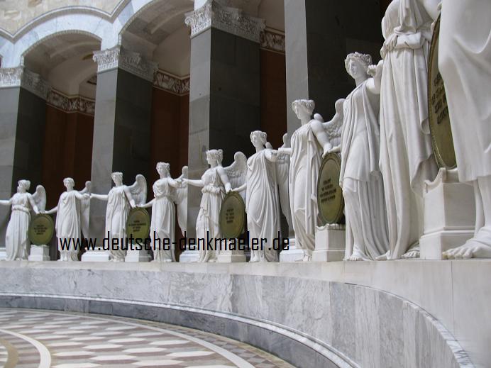 Außen an der Halle stehen Figuren, die Schilder mit den Namen der deutschen Volksstämme in die Höhe halten. Im Inneren halten überlebensgroße Marmorengel Schilder auf denen die Schlachten der Befreiungskriege aufgeführt sind. Diese Schilder wurden aus eroberten französischen Geschützen gefertigt.